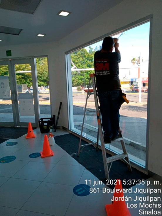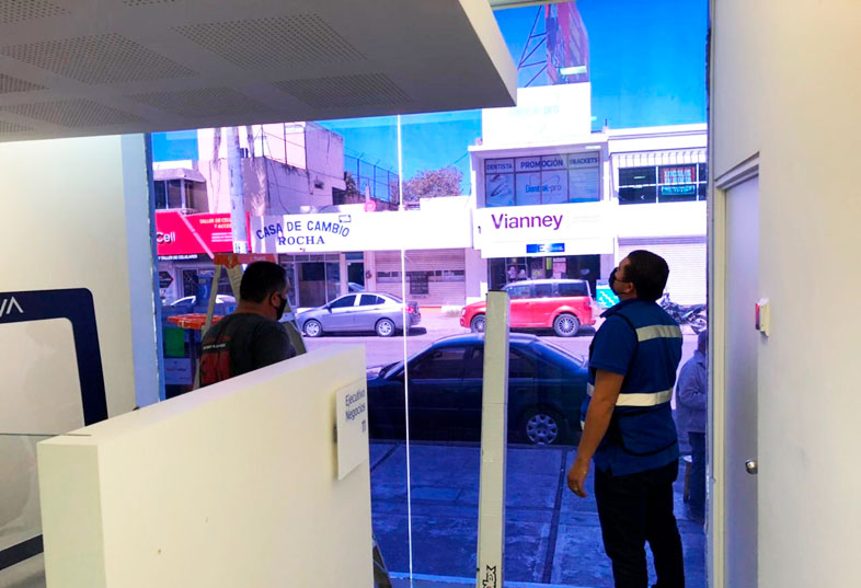 Suministro e instalación de películas térmicas transparentes y tonalizadas para reducir el calor y la luz que ingresa por los cristales del banco.